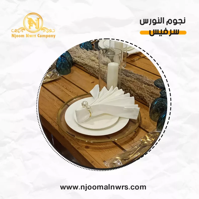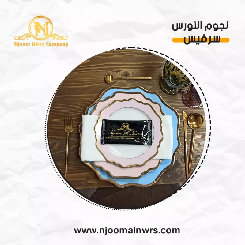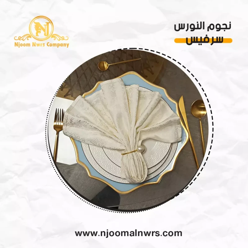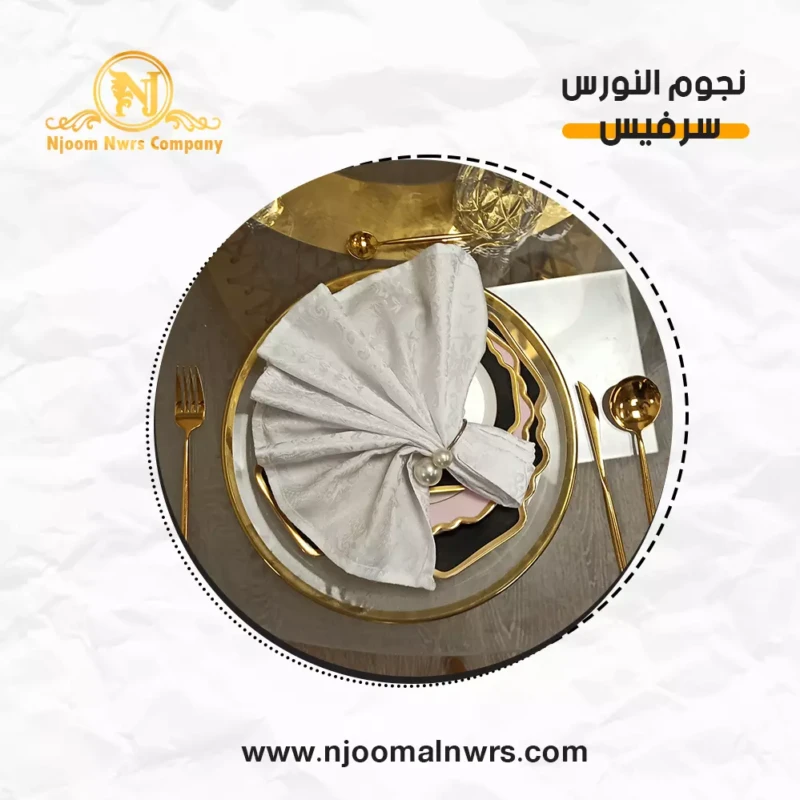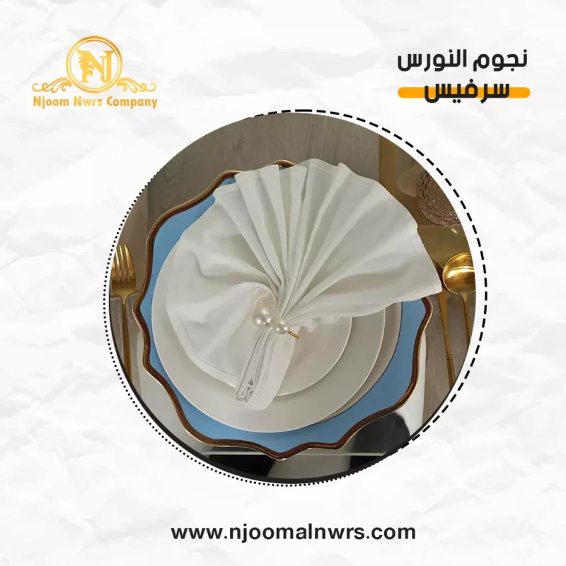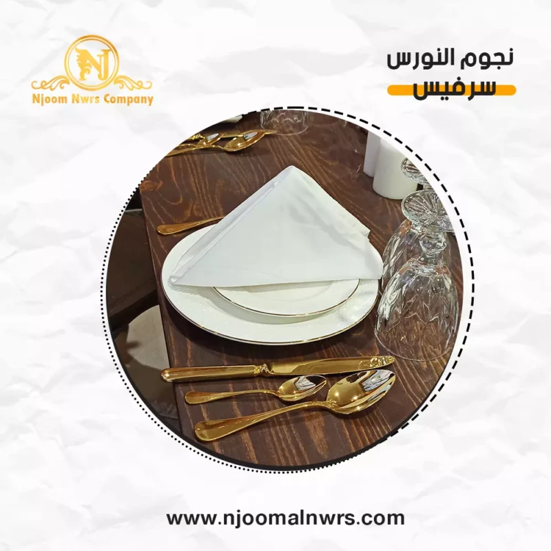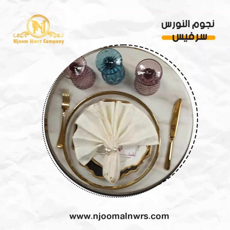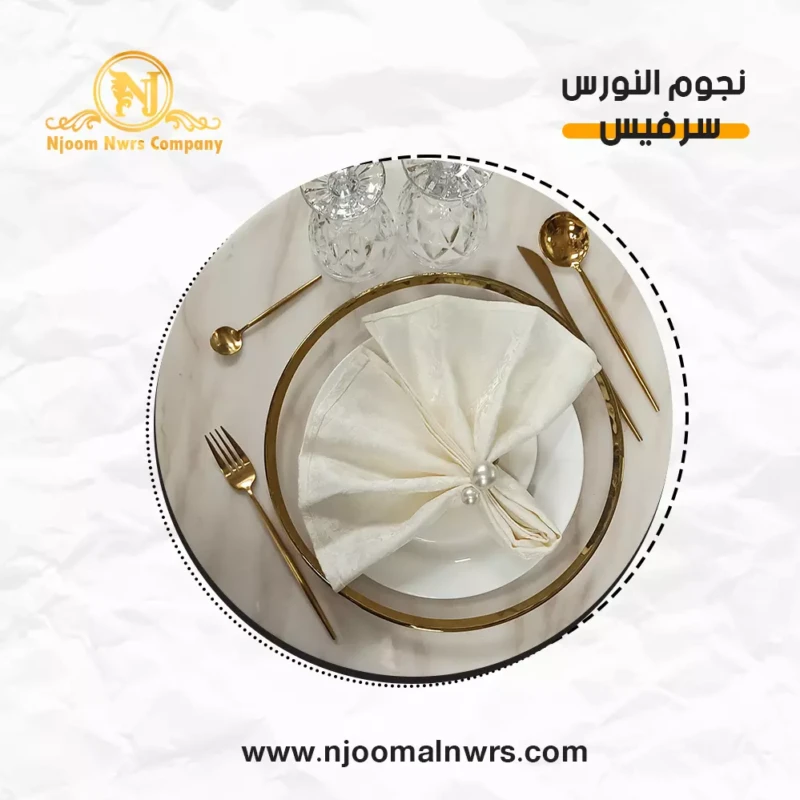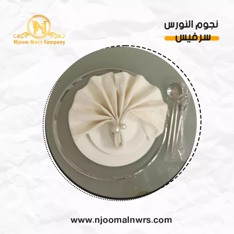 صحون كاسات ملاعق مناديل ورد على الصحن